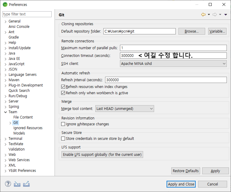 Window -> Preferences -> Team -> Git -> Remote connections -> Connection timeout 값 필요한 만큼 설정
