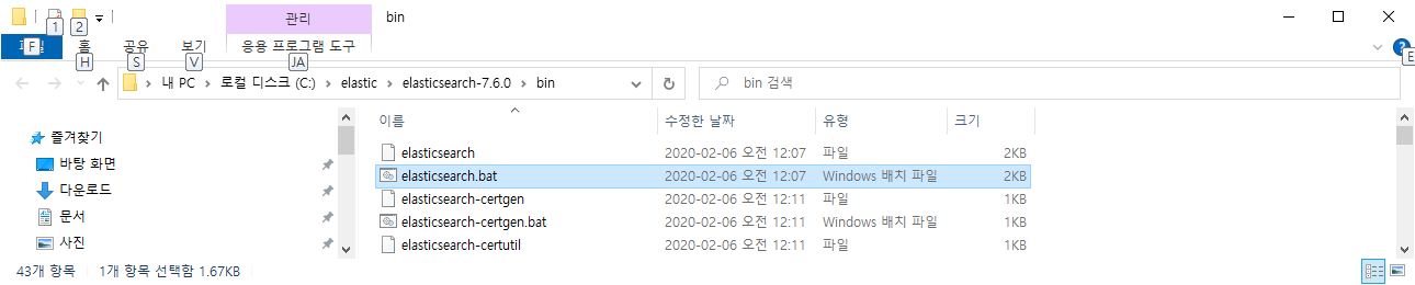 //설치 디렉터리 이동 후 (저는 cd C:\elastic\elasticsearch-7.6.0\bin 로 이동했습니다.)