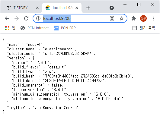 실행 완료 후, 웹 브라우저를 켜고 URL 입력 창에 "localhost:9200"을 치면